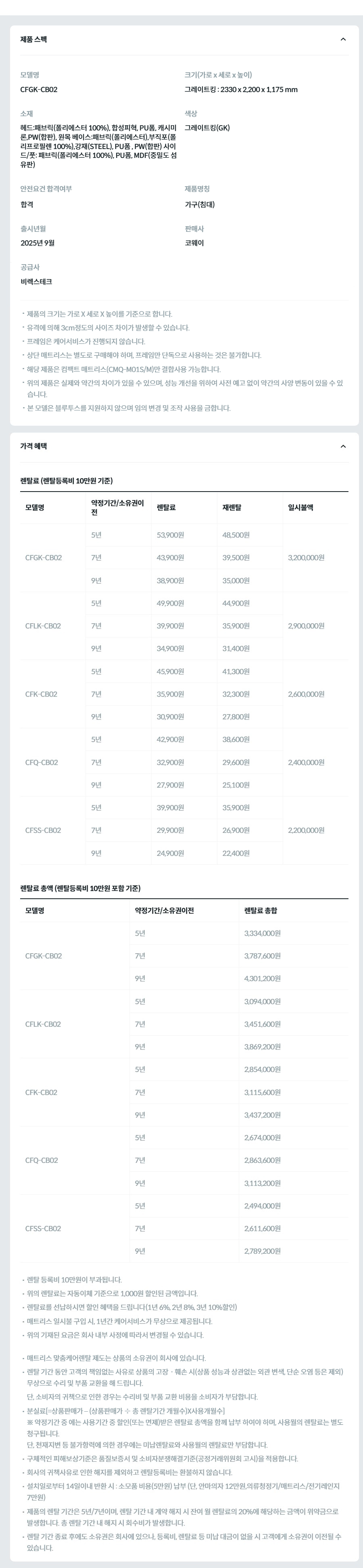 렌탈료 총합(렌탈 등록비 할인혜택 적용,프로모션 적용 기준)
